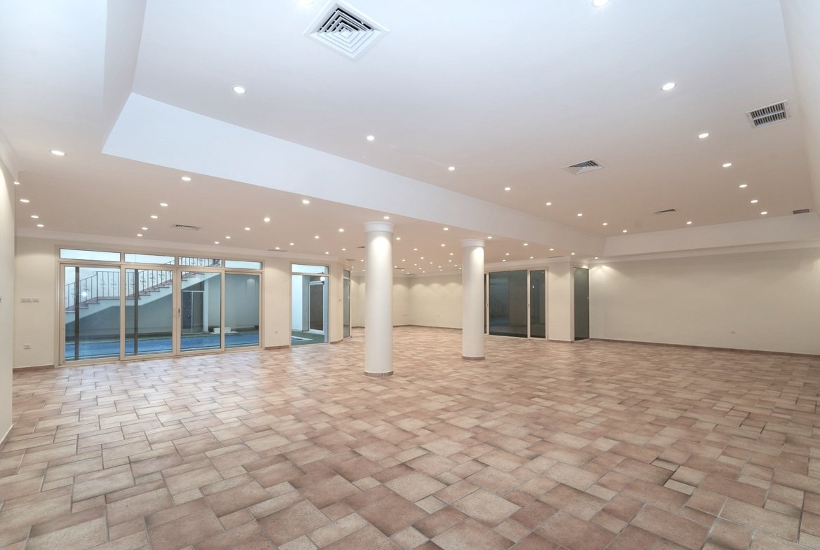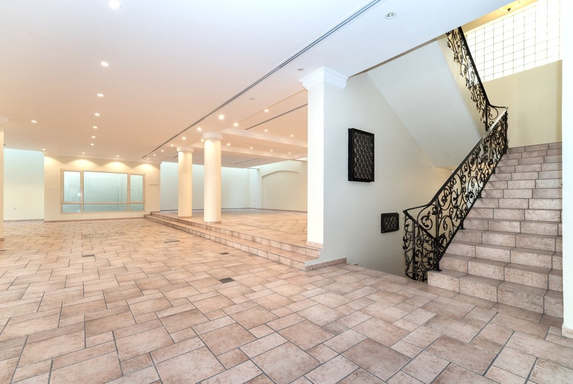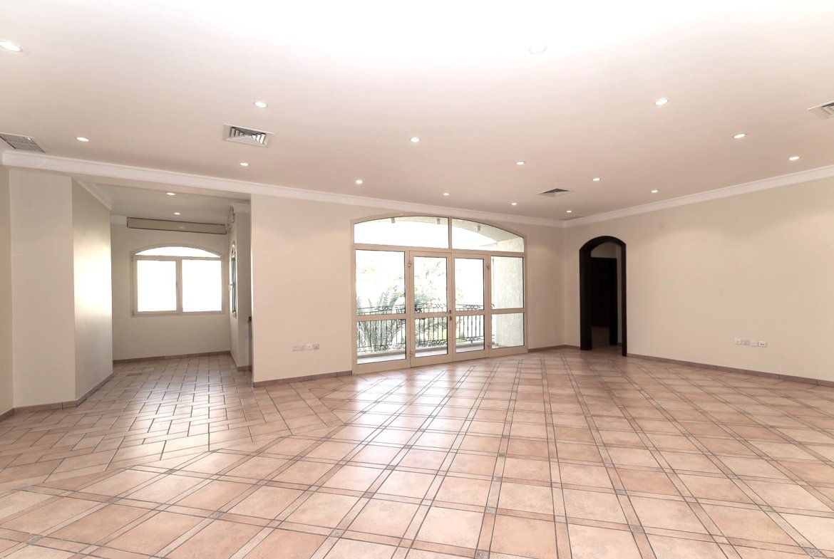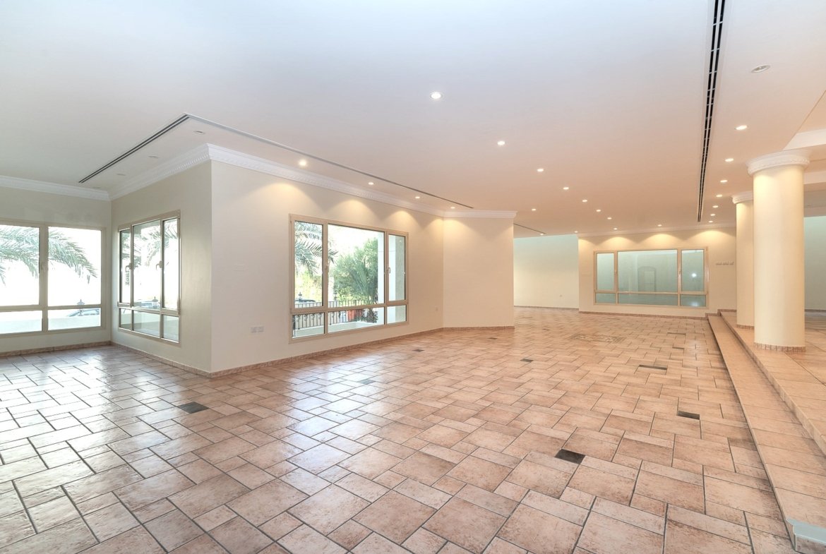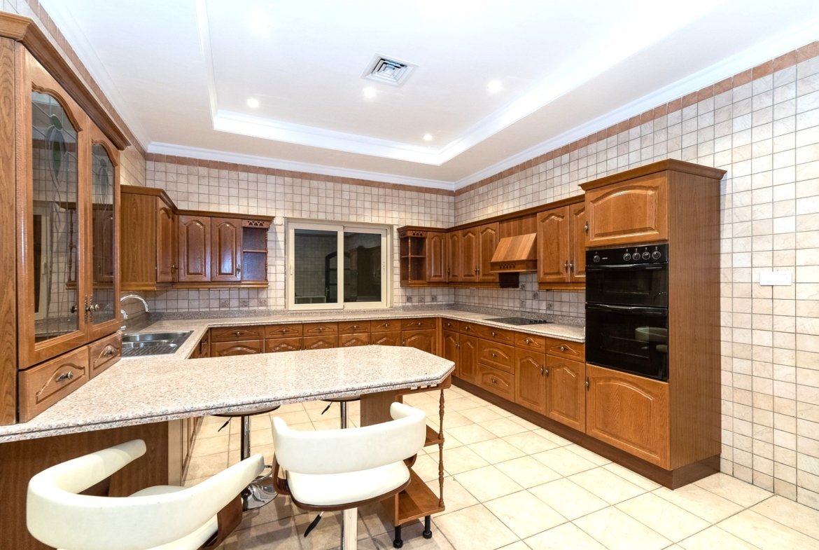 Elegant, spacious villa in Surra, Kuwait – 5 bedrooms, 5 bathrooms, large living and dining area, family lounge w/balcony, wooden kitchen, external kitchen.